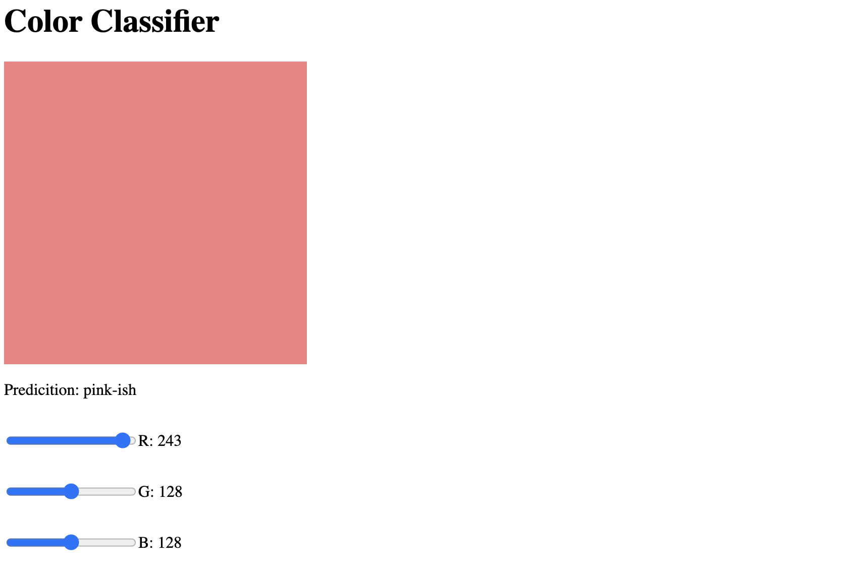 Finally, I trained the neural network using tensorflowjs and uploaded the model architecture and weights to the live github demo(color_classifier_model.json and color_classifier_model.weights.bin). I also wrote a simple HTML website and loaded in the model with javascript. I created some HTML elements to allow the user to select a color and a prediction was automatically made and displayed to the user based on the chosen color parameters(r, g, b).